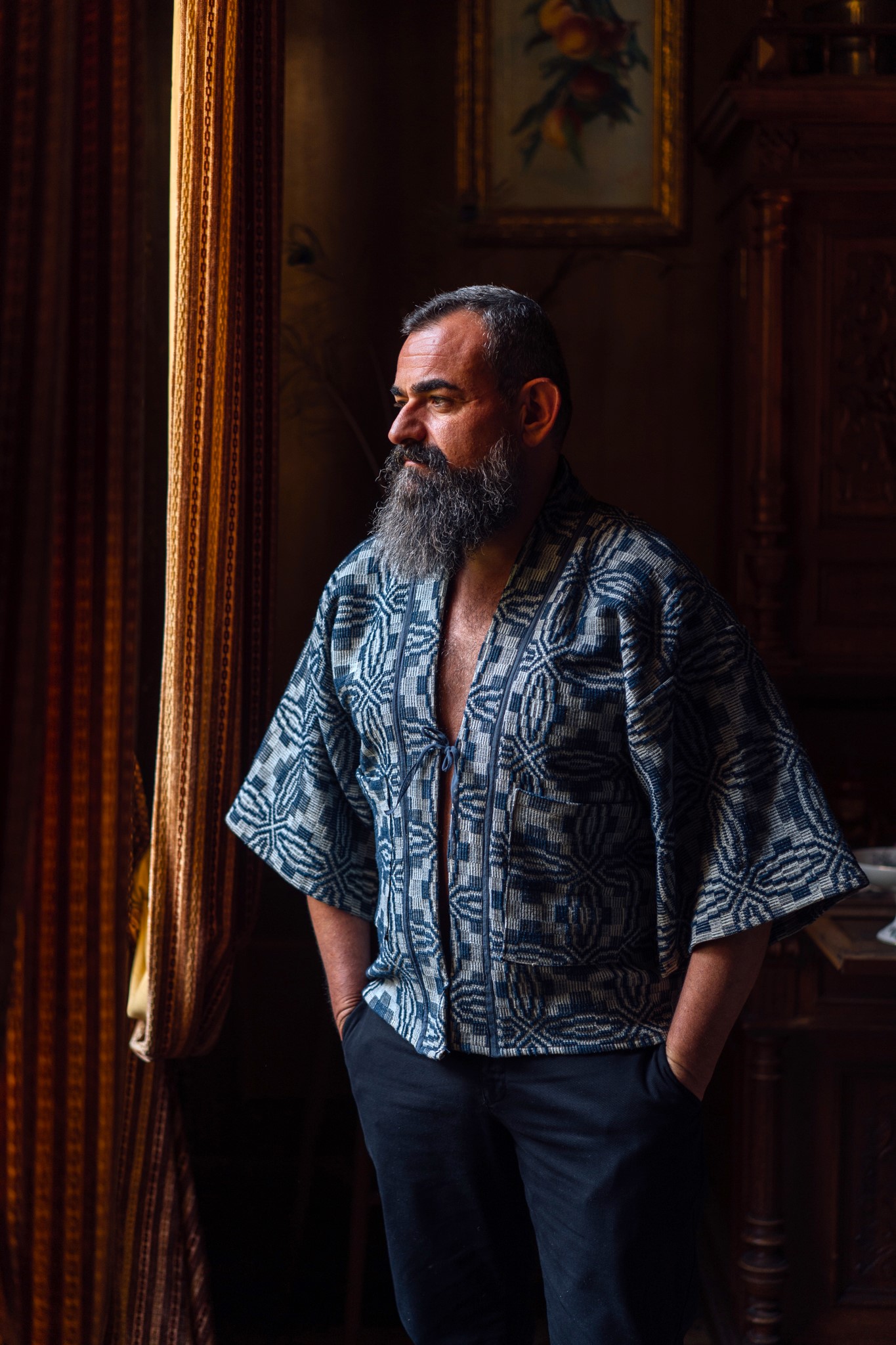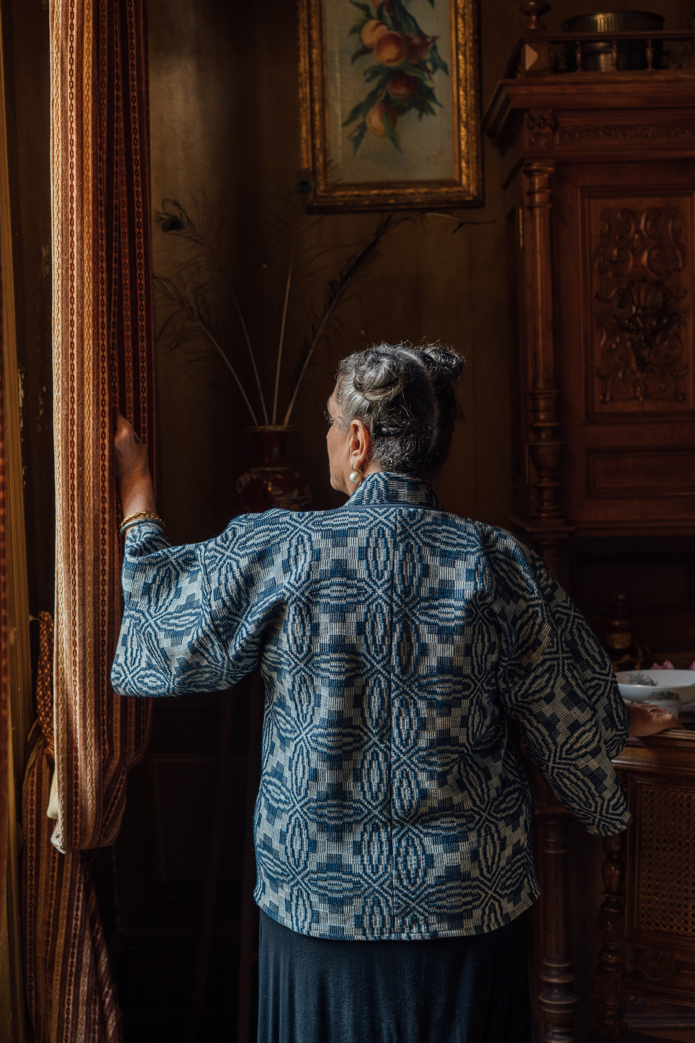Discover the allure of timeless elegance with a beautiful blue-white haori, made from a 120-year-old handmade fabric. The fabric was found in the mountainous village of Paleochori, in the wider area of Plomari, famous for its weavers. The fabric’s intricate craftsmanship and rich history are told in its cotton “caramel” pattern, which is created by combining the mito and loom treads, evoking a sense of warmth and nostalgia. Perfect for those who appreciate unique art and the stories woven into every thread.