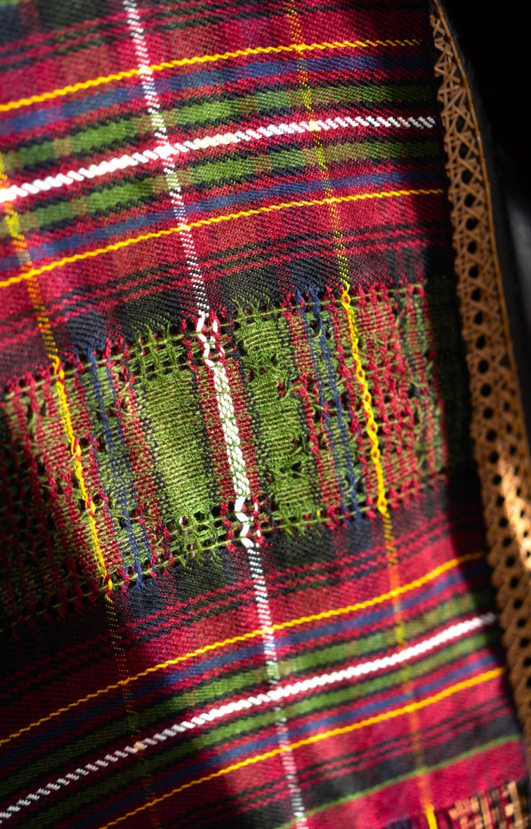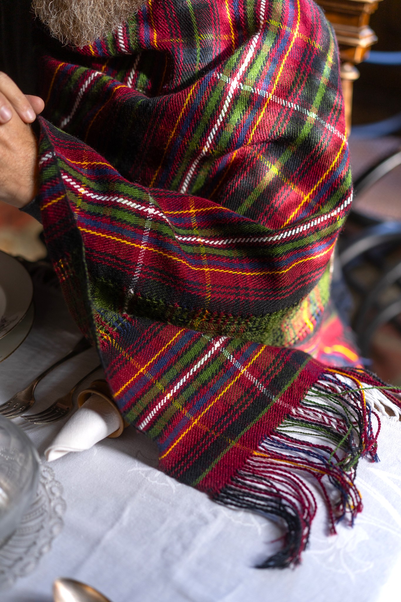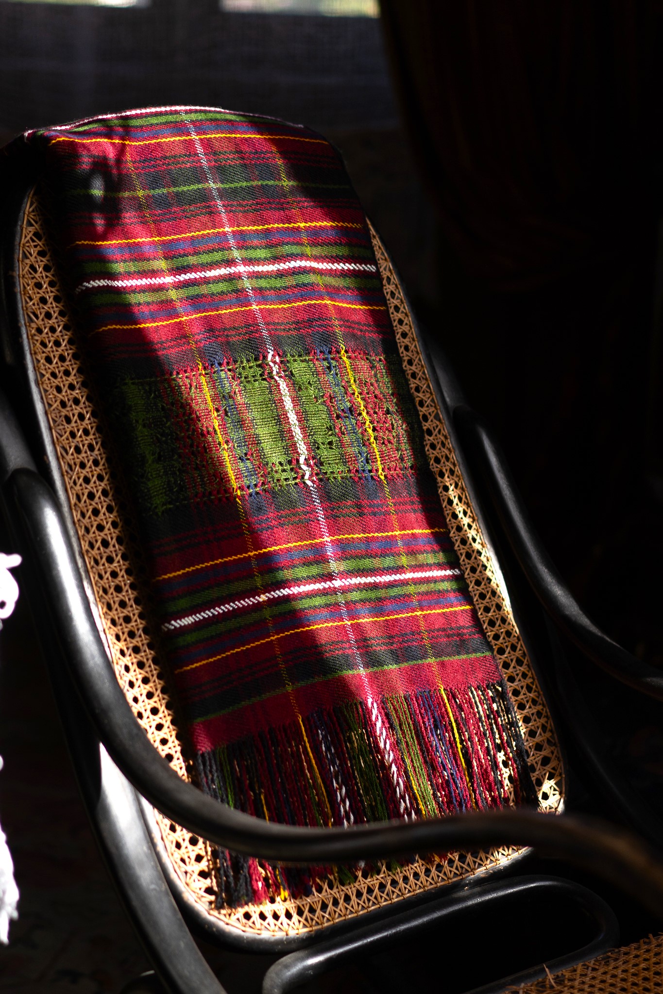 Wrap yourself in warmth and style with our handwoven wool scarf, featuring a unique blend of old wool threads in vibrant green, blue, red, yellow, and black. Perfect for chilly days, this cozy accessory adds a pop of color to any outfit while keeping you snug, just like the man in the plaid blanket.