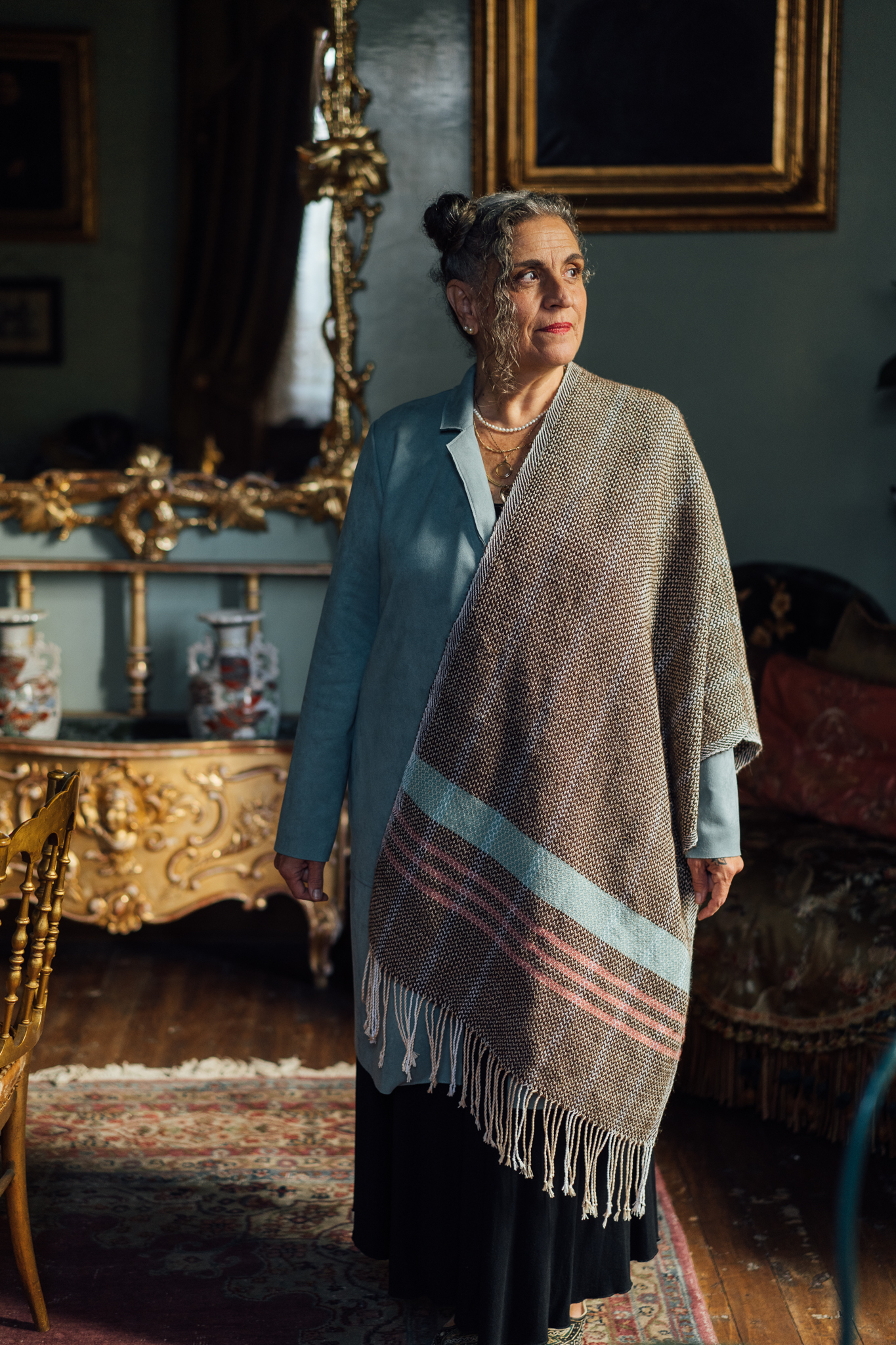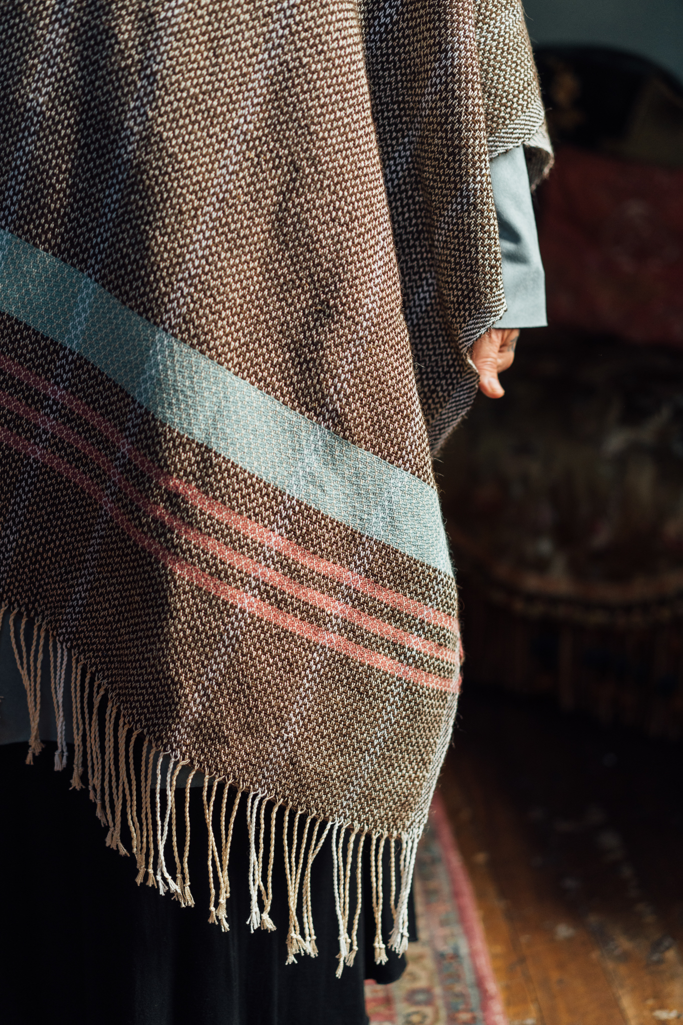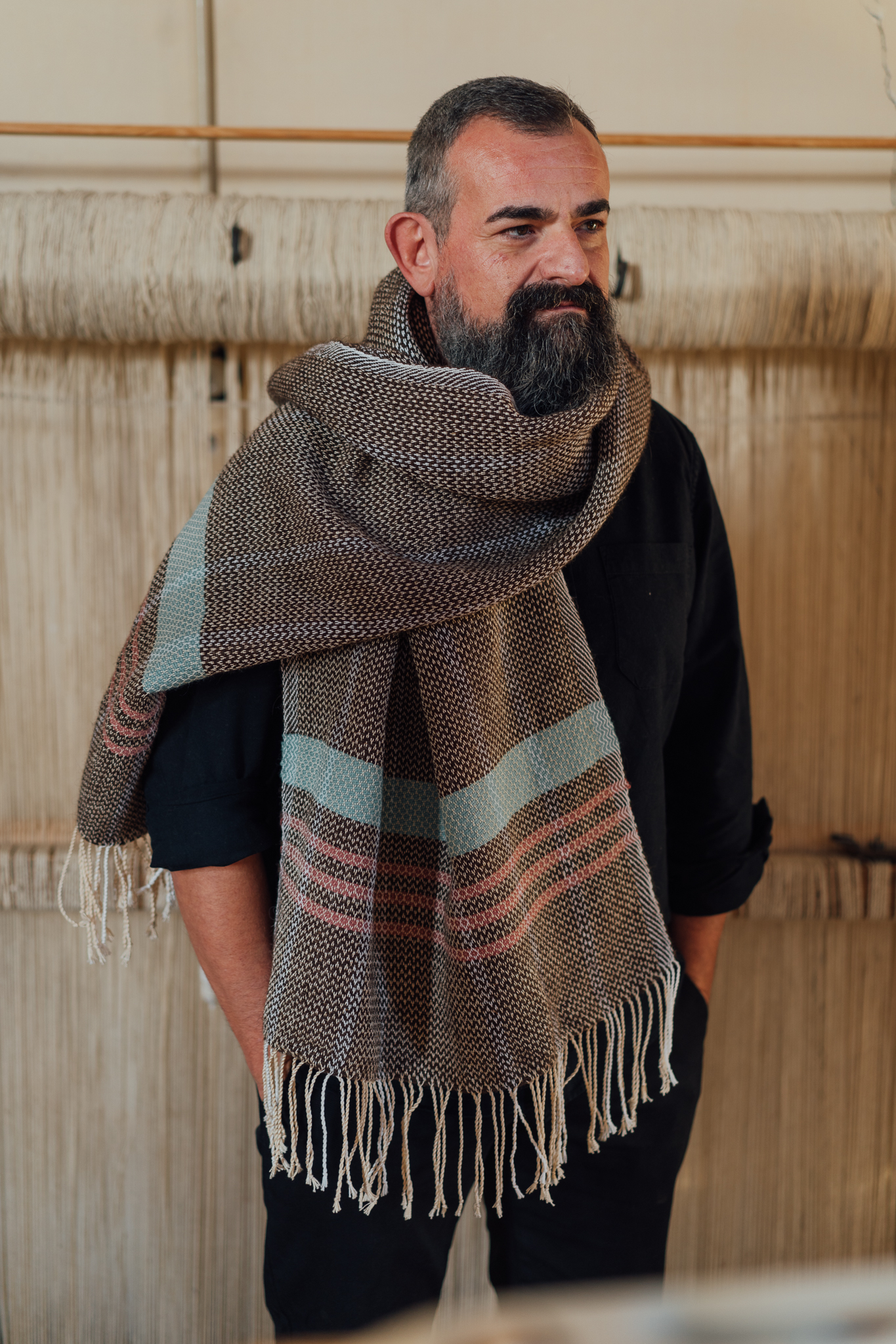 This exquisite handmade woolen scarf is a stunning accessory that combines great style and warmth. At an impressive 193cm long and 60cm wide, it features a delightful mix of earthy brown, pale pink and vibrant turquoise hues, making it a versatile piece that can elevate any outfit. The scarf is made mostly from old local sheep’s wool, bringing out its natural color, while the colorful woolen threads add a unique touch that reflects traditional craftsmanship. The brown of the pebbles of the beach of Nyfida, combined with the turquoise waters of the bay of Kalloni, provided the inspiration for this unique piece. The ends of the warps in vintage cotton lace provide a playful finish, enhancing its bohemian charm. Perfect for chilly days or as a statement piece for any occasion, this loose scarf not only protects you from the cold, but also tells a story of craftsmanship and heritage. Wrap yourself in this beautiful creation and enjoy the warmth and style it brings to your wardrobe.